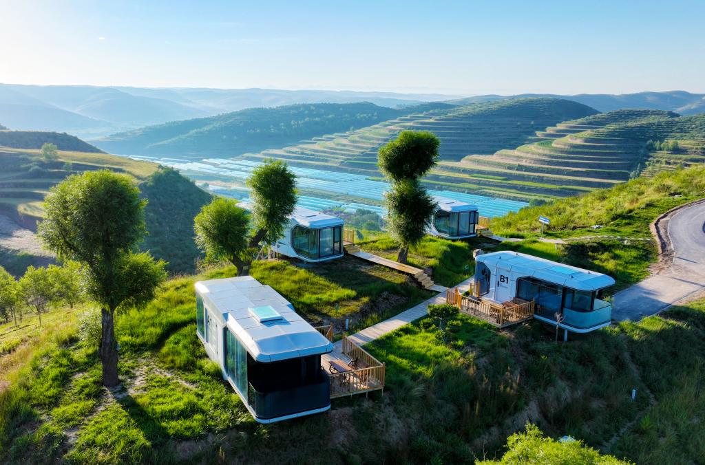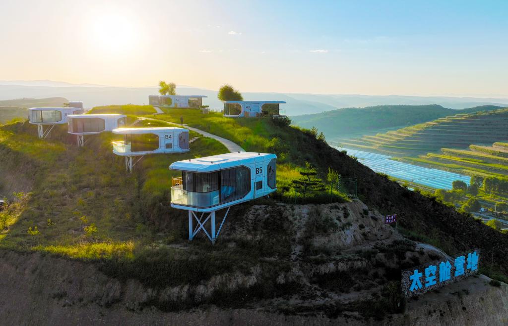 ↑2024年8月18日拍摄的宁夏回族自治区固原市西吉县新营乡甘井村旅游示范点“太空舱营地”。(无人机照片)CICPHOTO/袁宏彦 摄