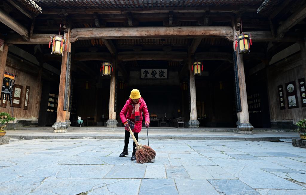敬爱堂始建于明万历年间,是西递村中最大的祠堂,占地面积超过1700平方米。胡晓雯自1991年成为敬爱堂的文保员起,她30多年如一日,全身心地投入到敬爱堂的保护工作中。一砖一瓦、一椽一木、一榫一卯,祠堂内的每一个角落,她都很熟悉。每天早晚,胡晓雯会对敬爱堂进行全面清洁,“墙壁、柱子的缝隙和楹联后面尤其要注意,经常会有蝙蝠留下粪便,要仔细清扫干净,否则会特别难闻。”类似的经验,她已经总结了很多。