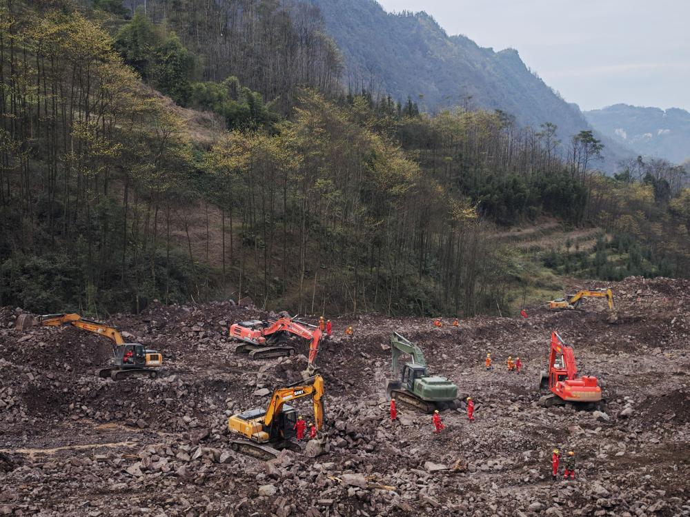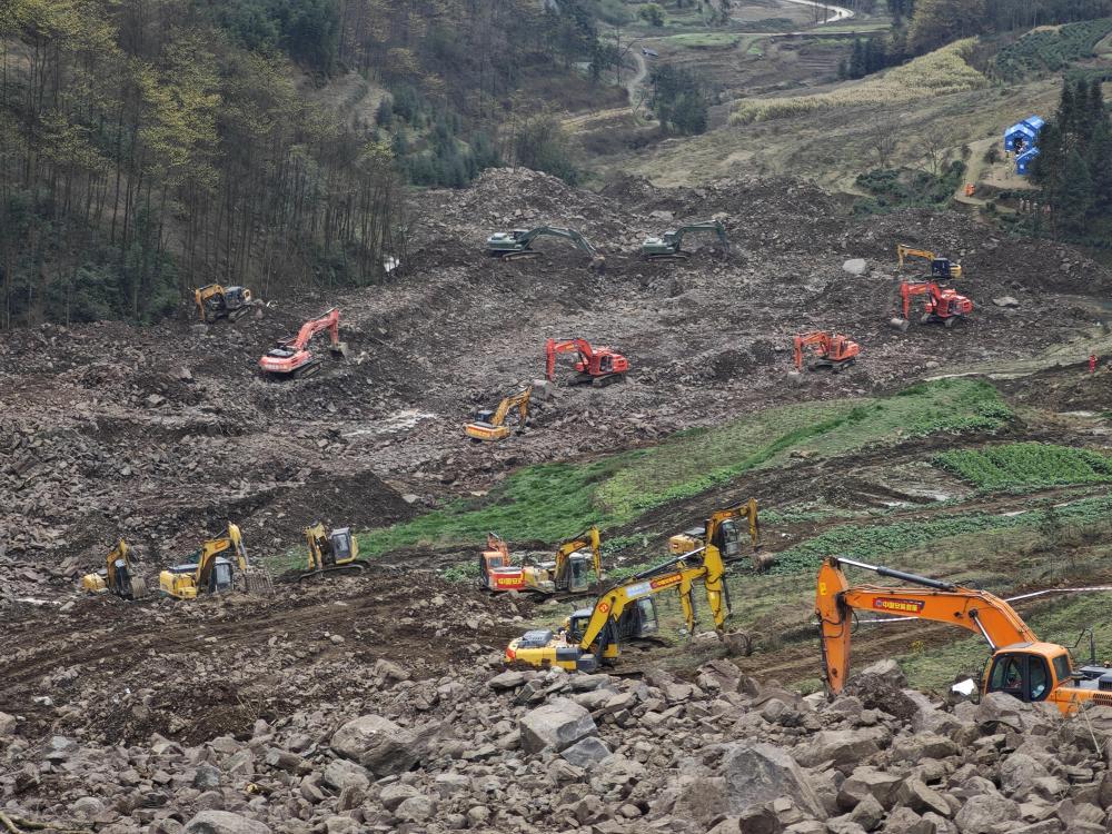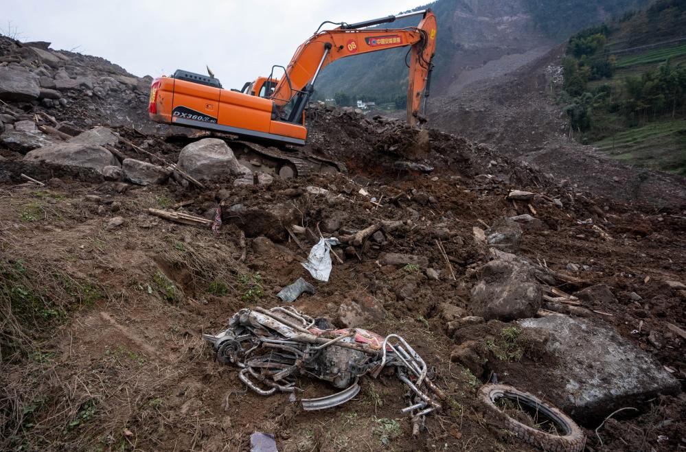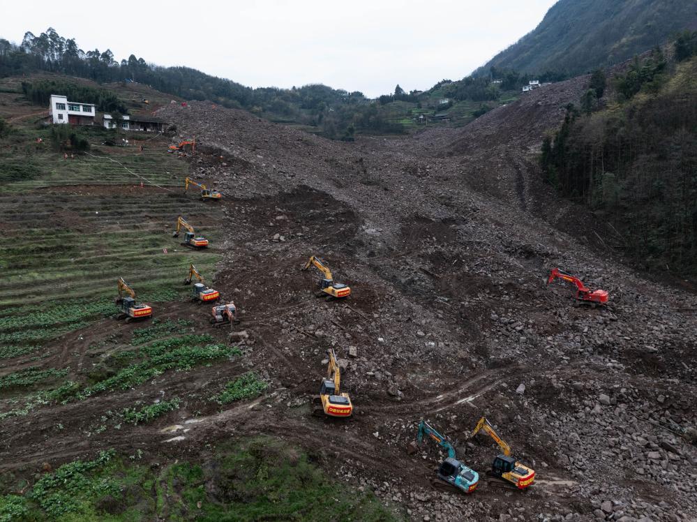 2月10日,挖掘机在山体滑坡现场救援。