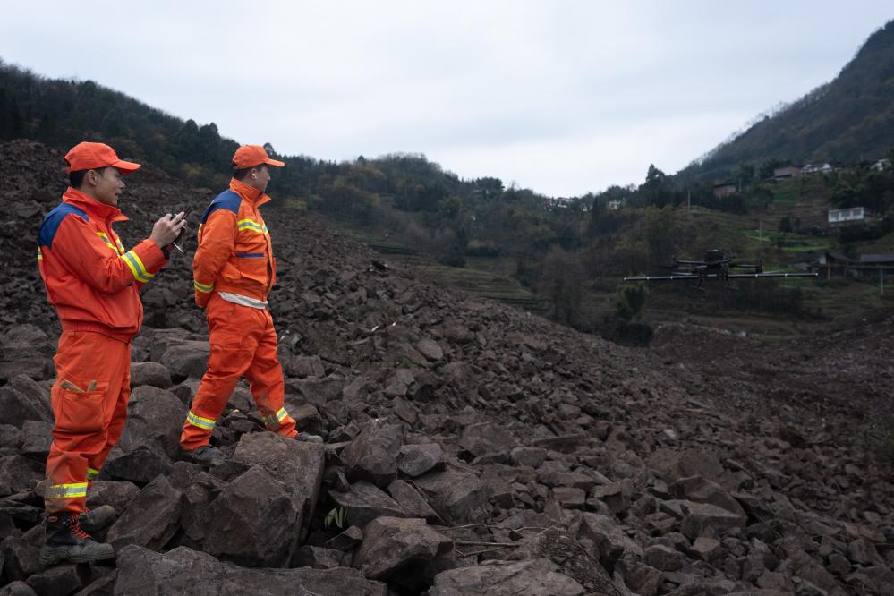 2月10日,在山体滑坡现场,应急管理部上海消防研究所工作人员操控无人机进行监测。