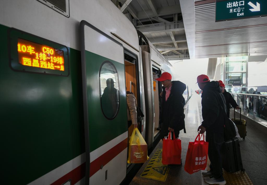 2月11日,在西昌西站,外出务工人员搭乘C50次列车前往成都务工。