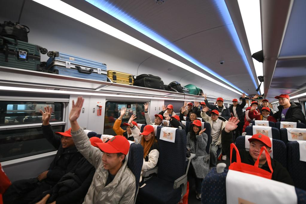 2月11日,外出务工人员在C50次列车上合影。