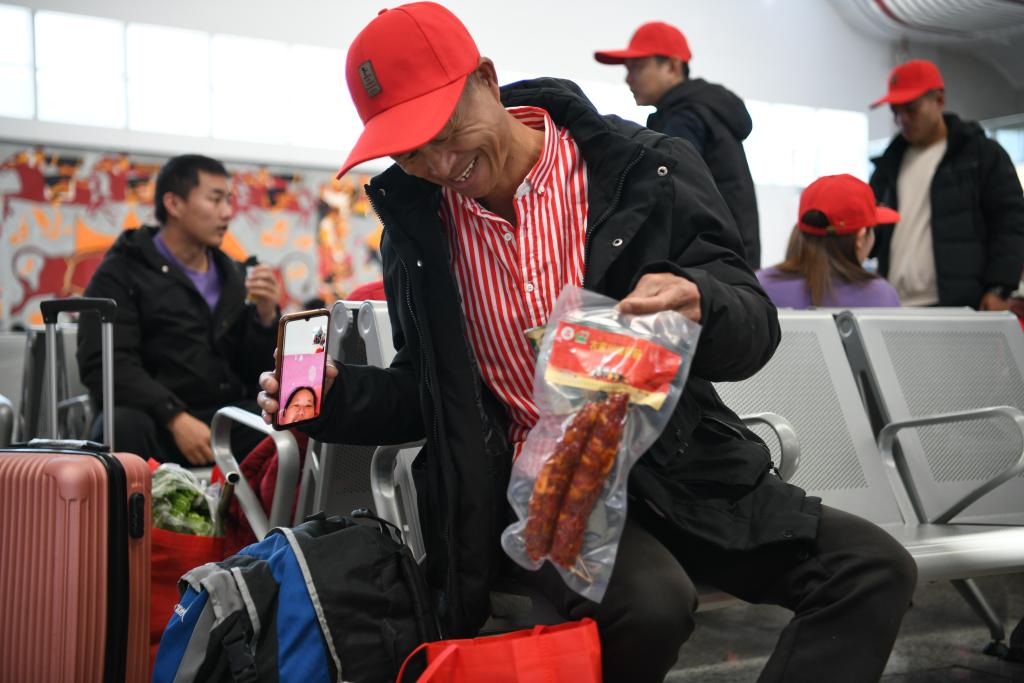 2月11日,在西昌西站,来自凉山州宁南县的杨碧富与家人视频连线,展示爱心礼包中的食品。