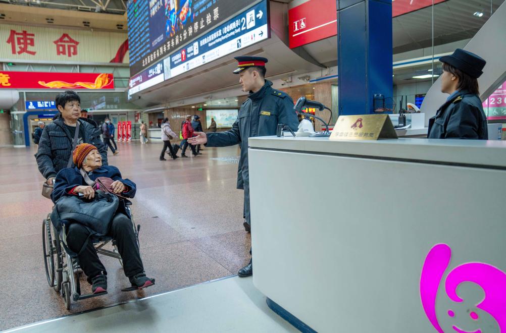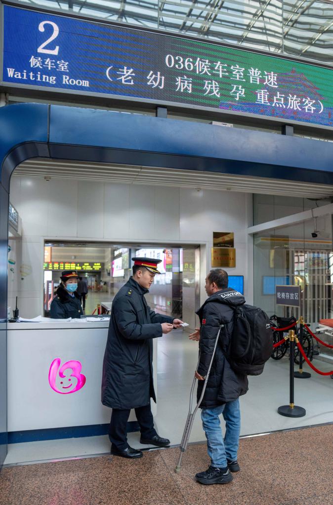 2月18日,北京西站“036候车室”客运员杨晋宇(右二)在引导行动不便的旅客进入候车室。