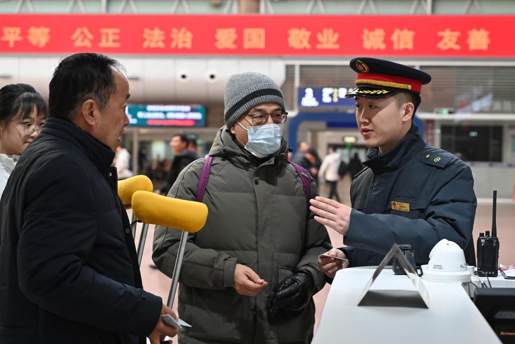 2月18日,北京西站“036候车室”客运员杨晋宇(左)在查验旅客证件。