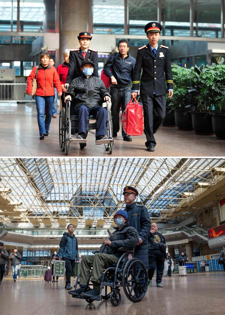 拼版照片:上图为北京西站“036候车室”第五任负责人王琳娜(中后)转运行动不便的旅客(资料照片,新华社发);下图为北京西站“036候车室”客运员袁伟将行动不便的旅客推至候车室(新华社记者任鹏飞2月18日摄)。