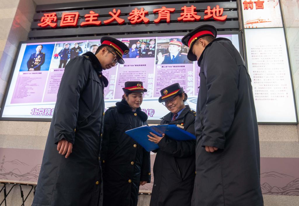 2月18日,北京西站“036候车室”第五任负责人王琳娜(右二)和同事交流工作。