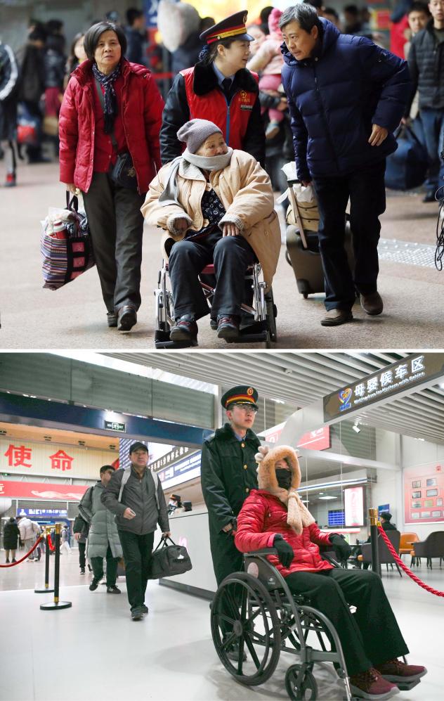 2月18日,在北京西站“036候车室”,客运员冯雪(左二)搀扶行动不便的旅客落座。