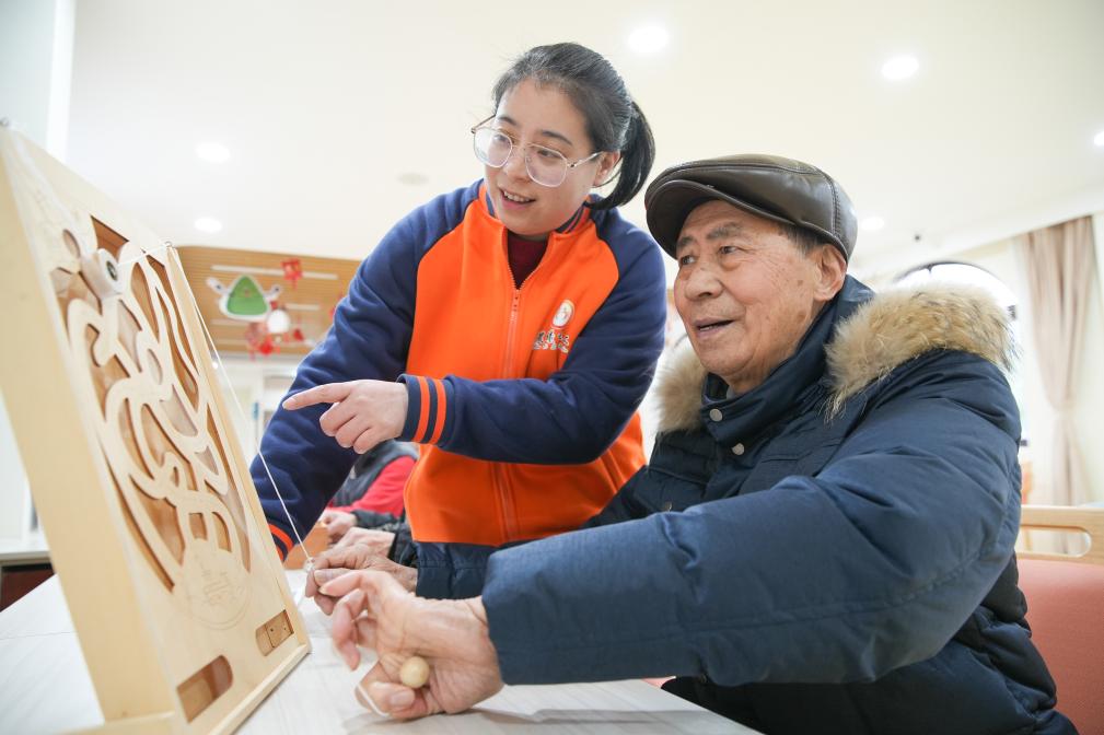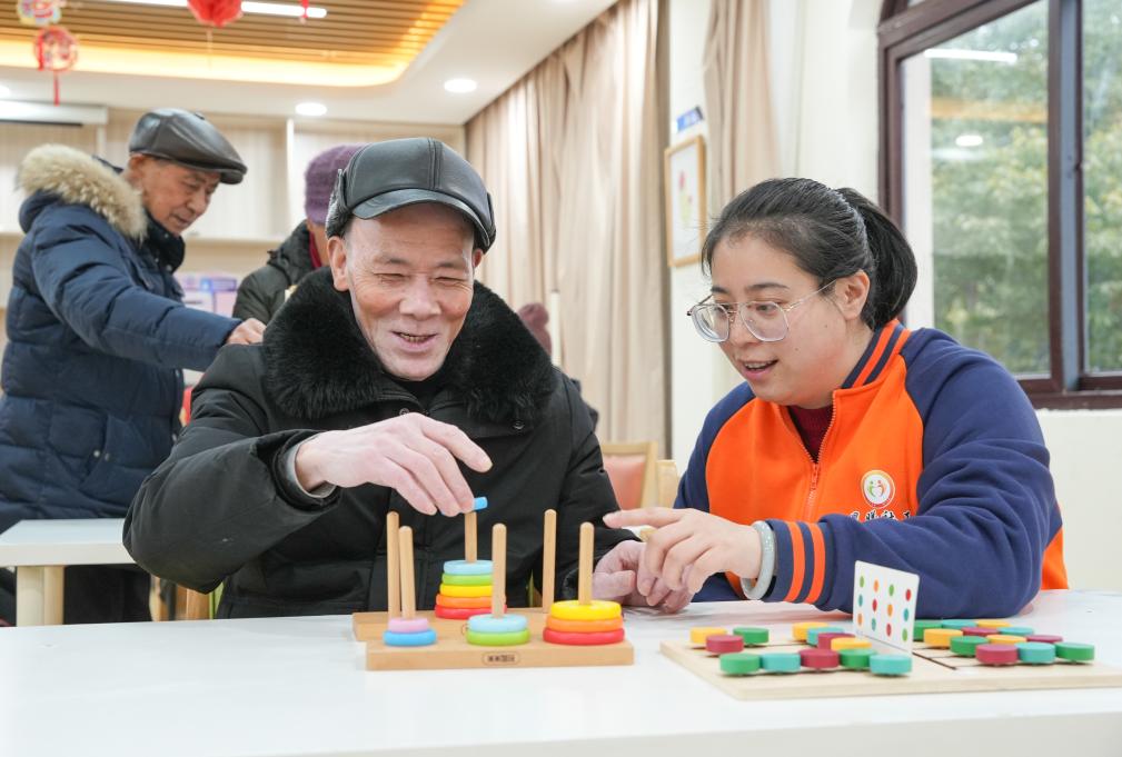 ↑2025年2月20日,在浙江省湖州市德清县武康街道示范型居家养老服务中心,老人在进行智力拓展游戏。CICPHOTO/王树成 摄