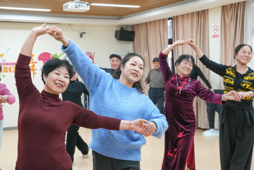 ↑2025年2月20日,在浙江省湖州市德清县武康街道示范型居家养老服务中心,老人们在跳舞。CICPHOTO/王树成 摄
