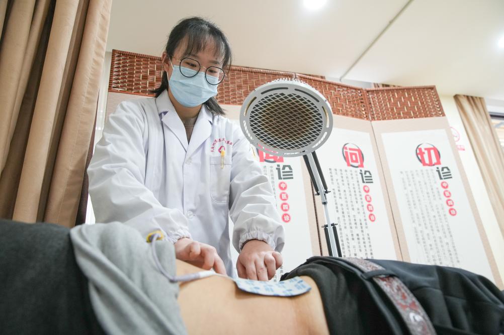 ↑2025年2月20日,在浙江省湖州市德清县武康街道示范型居家养老服务中心,社区医生在为老人进行针灸治疗。CICPHOTO/王树成 摄