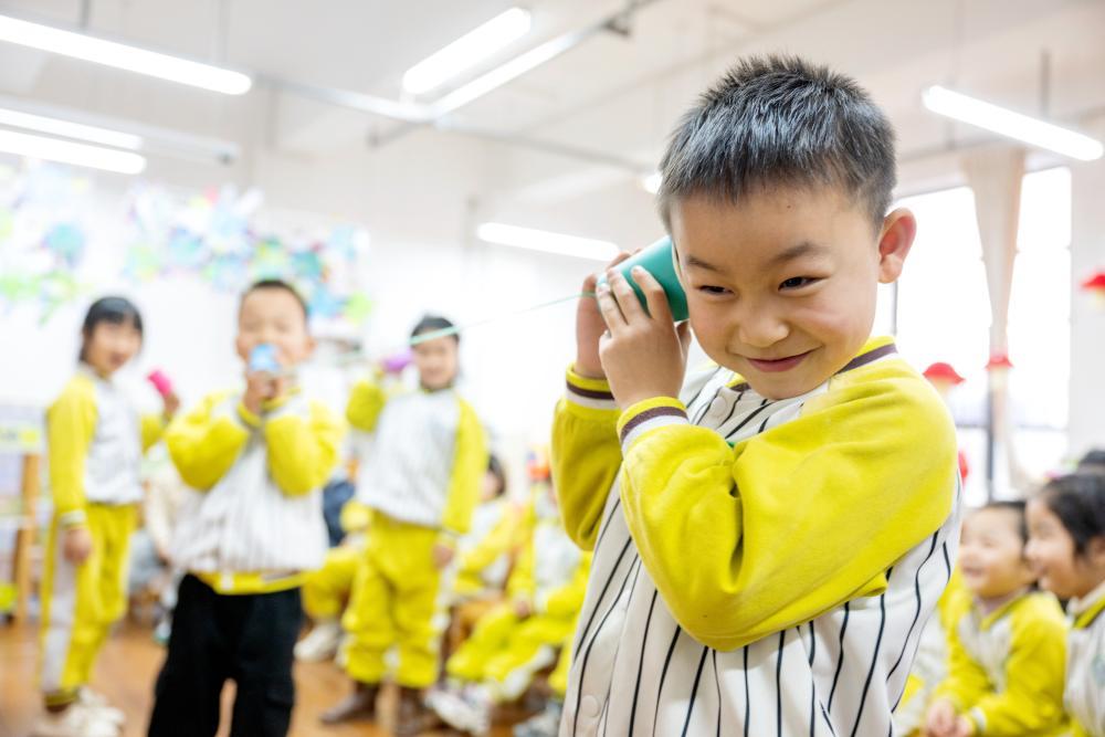 3月3日,浙江省湖州市长兴县龙山幼儿园,孩子们利用自制的传声筒听取声音。