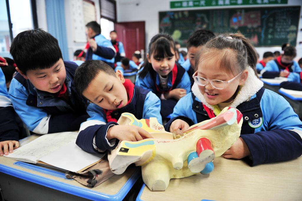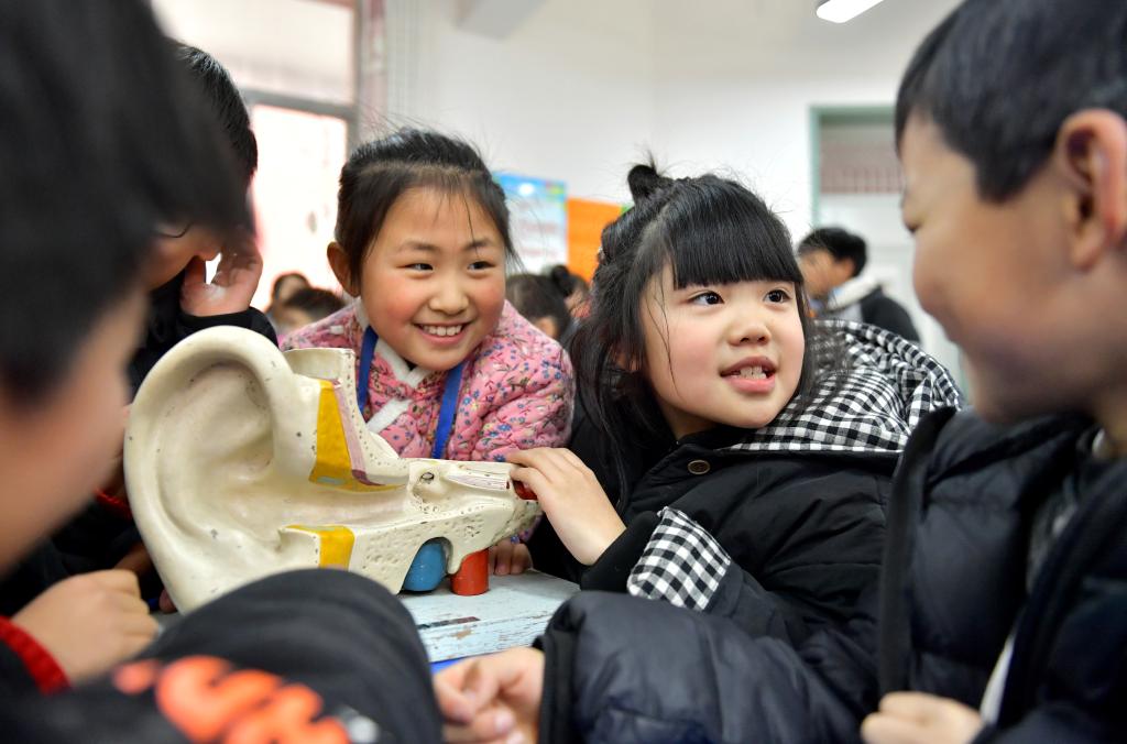 3月3日,在湖北省宜昌市秭归县实验小学,学生们了解耳朵构造。