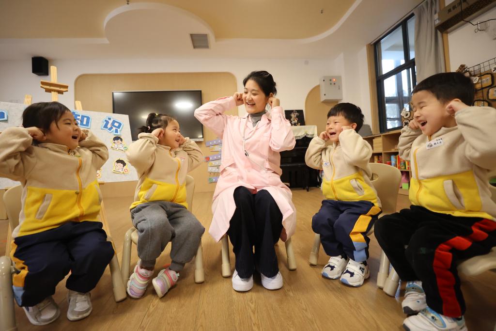 3月3日,在河南省开封市河南大学幼儿园金明园区教室里,保健老师与孩子互动做护耳游戏。