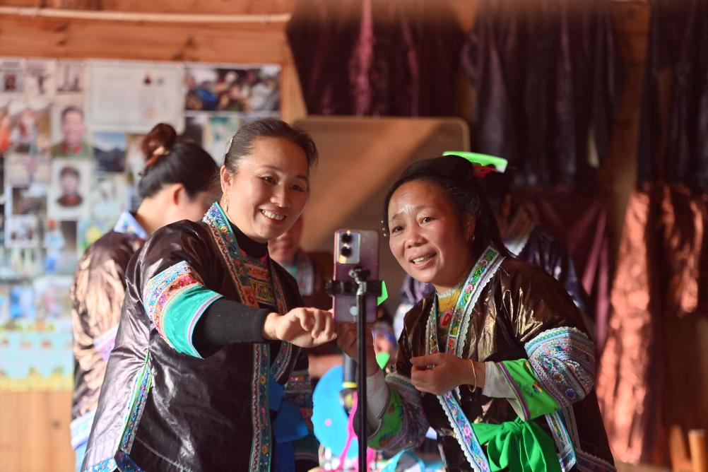 在广西柳州市融水苗族自治县杆洞乡党鸠村,杨洪英(左)向网友展示苗族刺绣技艺(3月3日摄)。