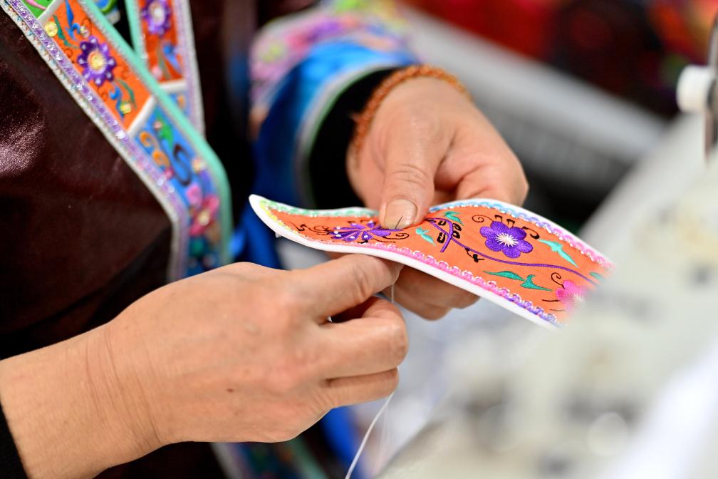 在广西柳州市融水苗族自治县杆洞乡杆洞村,杨洪英(右)在苗衣制作基地工作(2月27日摄)。