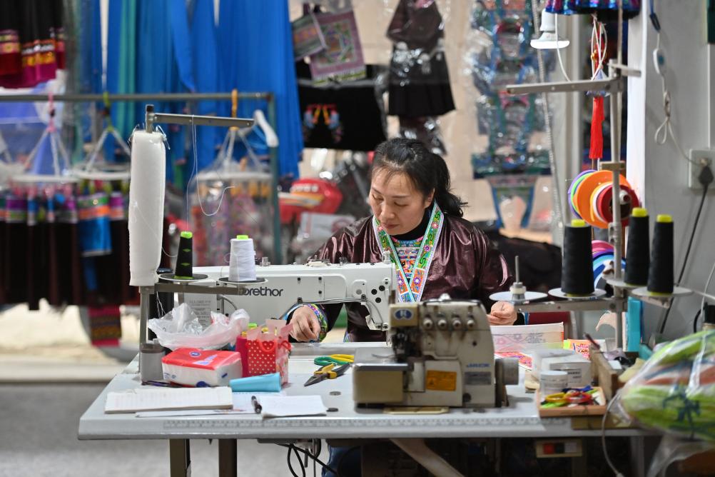 在广西柳州市融水苗族自治县杆洞乡杆洞村,杨洪英在苗衣制作基地工作(3月4日摄)。
