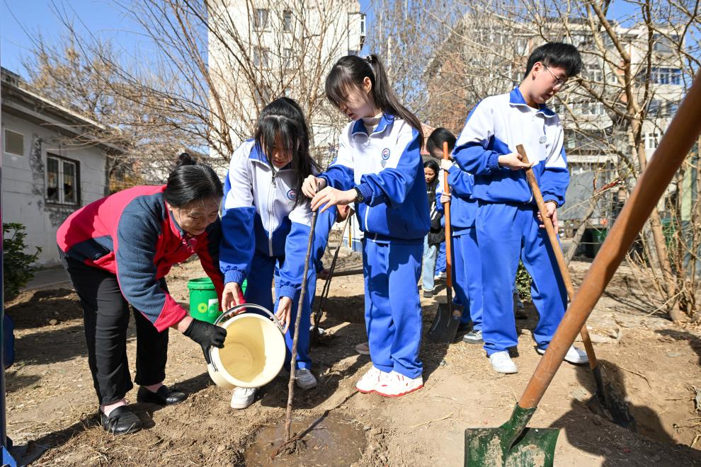 3月12日,在天津市东丽区无瑕街道圆月里社区,社区志愿者与天津钢管公司中学学生为新栽种的树苗浇水。