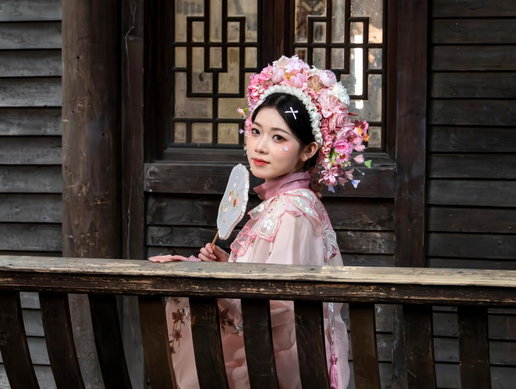 一名游客头戴“簪花”在福州市千年古街三坊七巷里打卡留影(2月3日摄)。