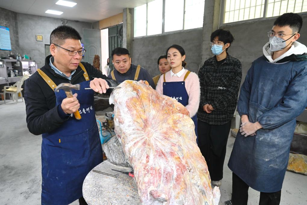 3月5日,中国工艺美术大师陈礼忠(左一)在给学生示范寿山石雕刻技法。