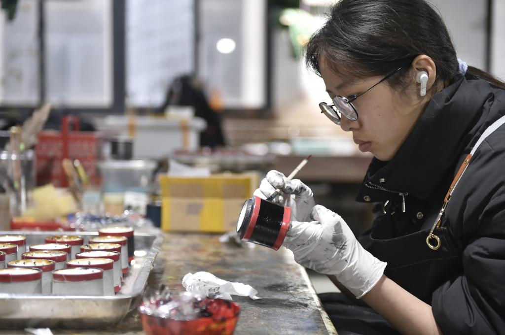 3月6日,在福州漆研堂文化传播有限公司生产车间,工作人员在制作漆艺茶具产品。