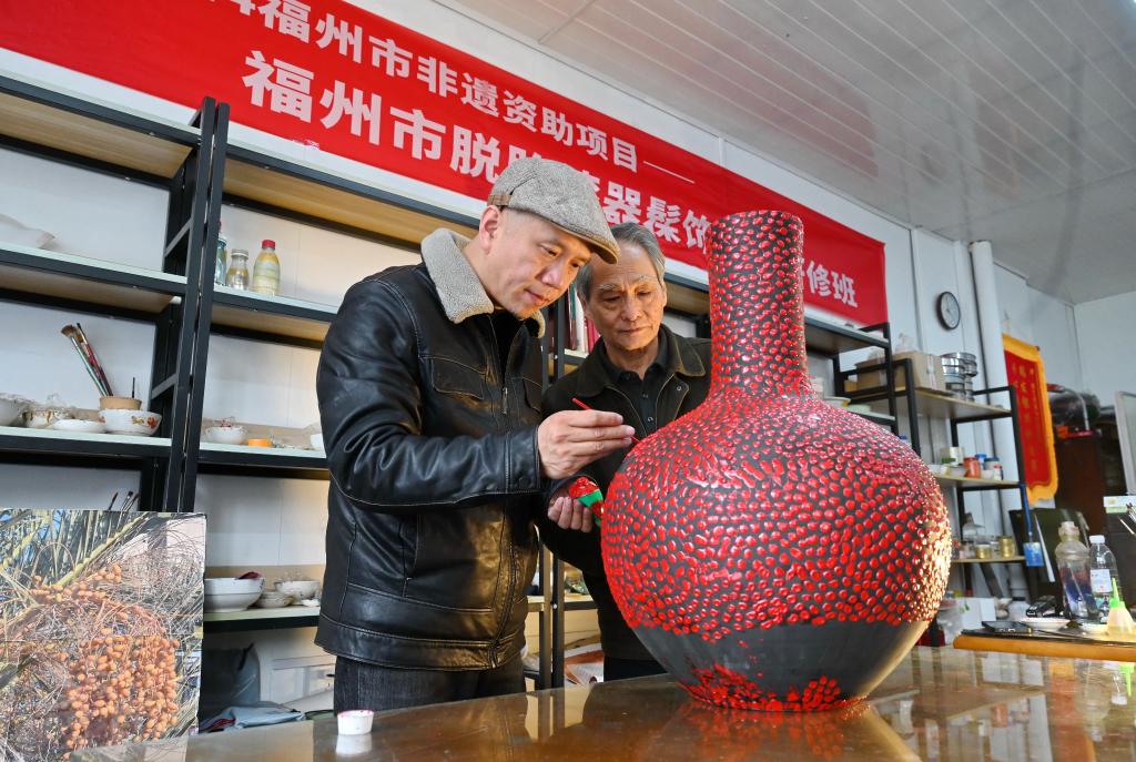 3月6日,福建省工艺美术大师陈天灨(右)在指导学生进行漆器髹饰技法。