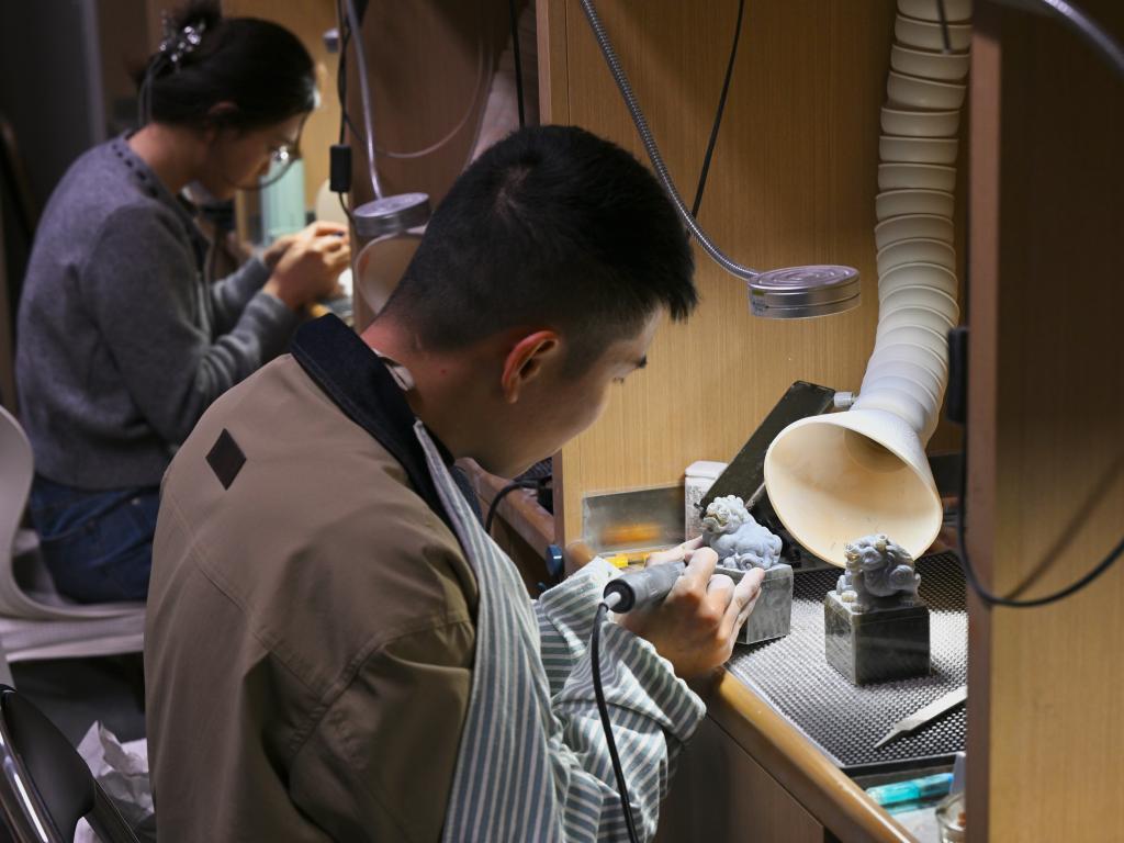 3月6日,在福建省工艺美术大楼寿山石雕刻工作间,两名青年雕刻师在雕刻寿山石。