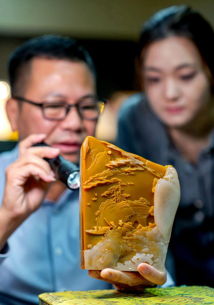 3月8日,寿山石爱好者在福州藏天园寿山石交易市场选购寿山石。