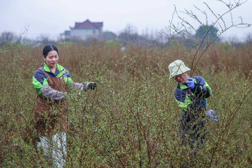 3月12日,在嘉兴市南湖区的嘉兴市神润斋鲜花种植基地,工作人员在剪切雪柳,准备制作成鲜切花花束后发往外地。