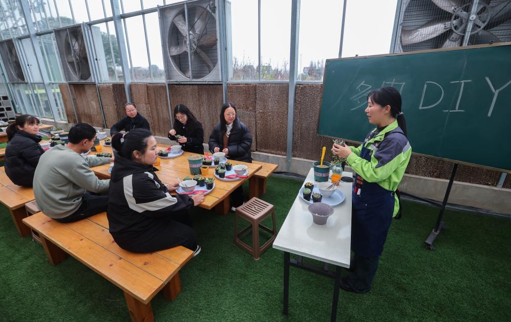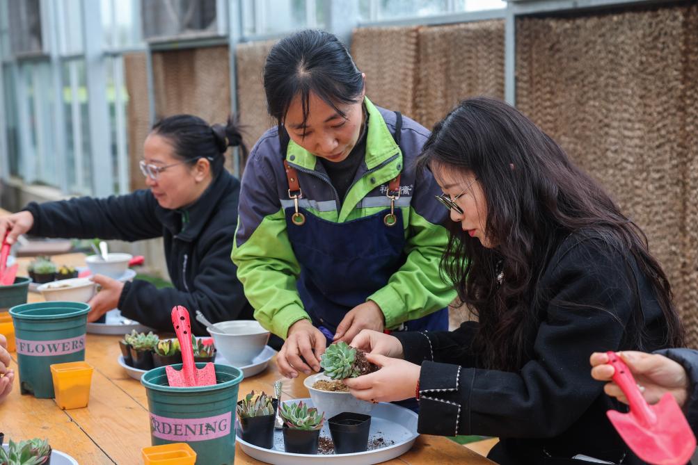 3月12日,在嘉兴市南湖区的嘉兴市神润斋鲜花种植基地,工作人员在教游客种植多肉植物。