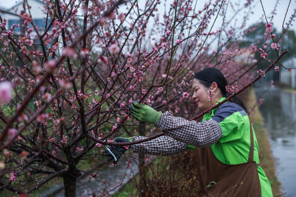 3月12日,在嘉兴市南湖区的嘉兴市神润斋鲜花种植基地,工作人员在剪切梅花,准备制作成鲜切花花束后发往外地。