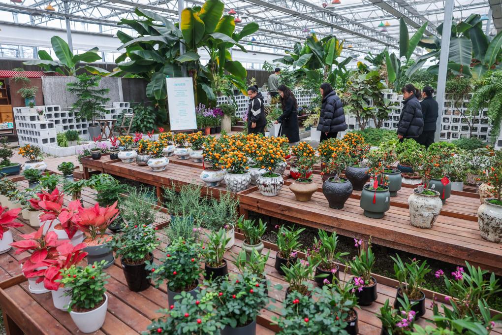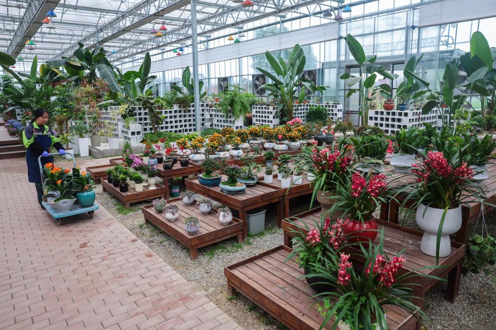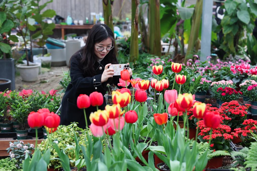 3月12日,游客在嘉兴市南湖区的嘉兴市神润斋鲜花种植基地观赏各类盆栽鲜花和植物。嘉兴市神润斋鲜花种植基地是浙江省现代农业精品示范园、浙江省乡村旅游示范点,年产花卉30万株。