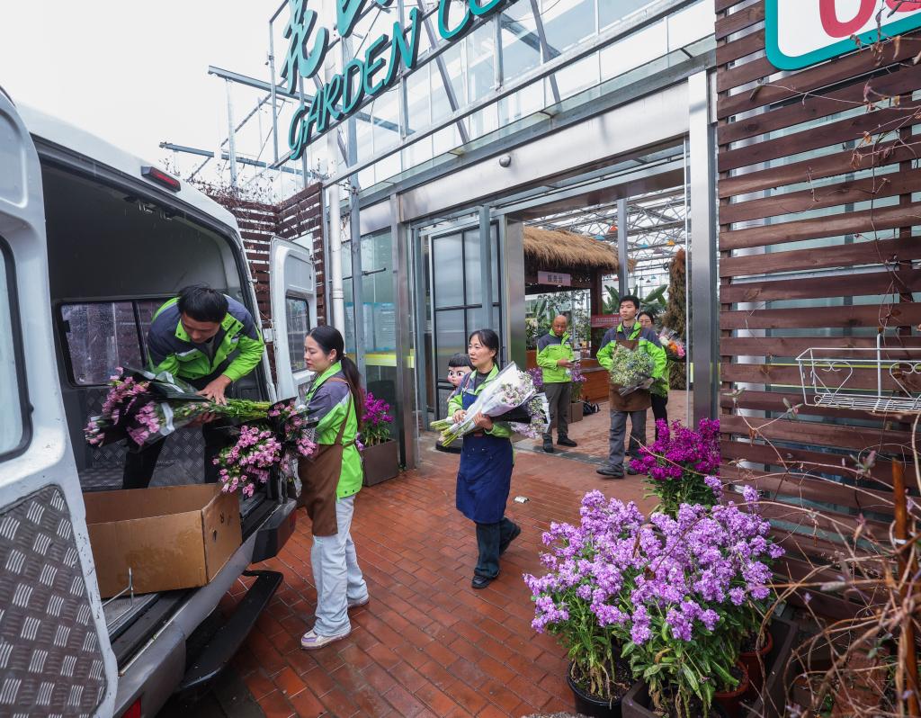 3月12日,在嘉兴市南湖区的嘉兴市神润斋鲜花种植基地,工作人员把打包好的鲜切花装车运往外地。
