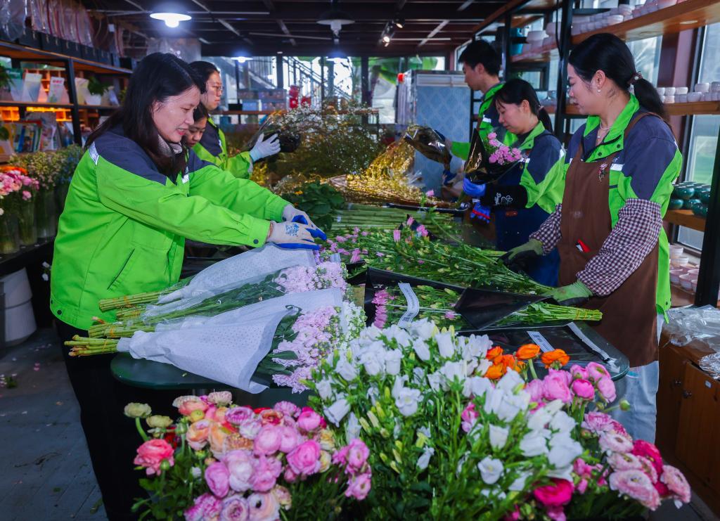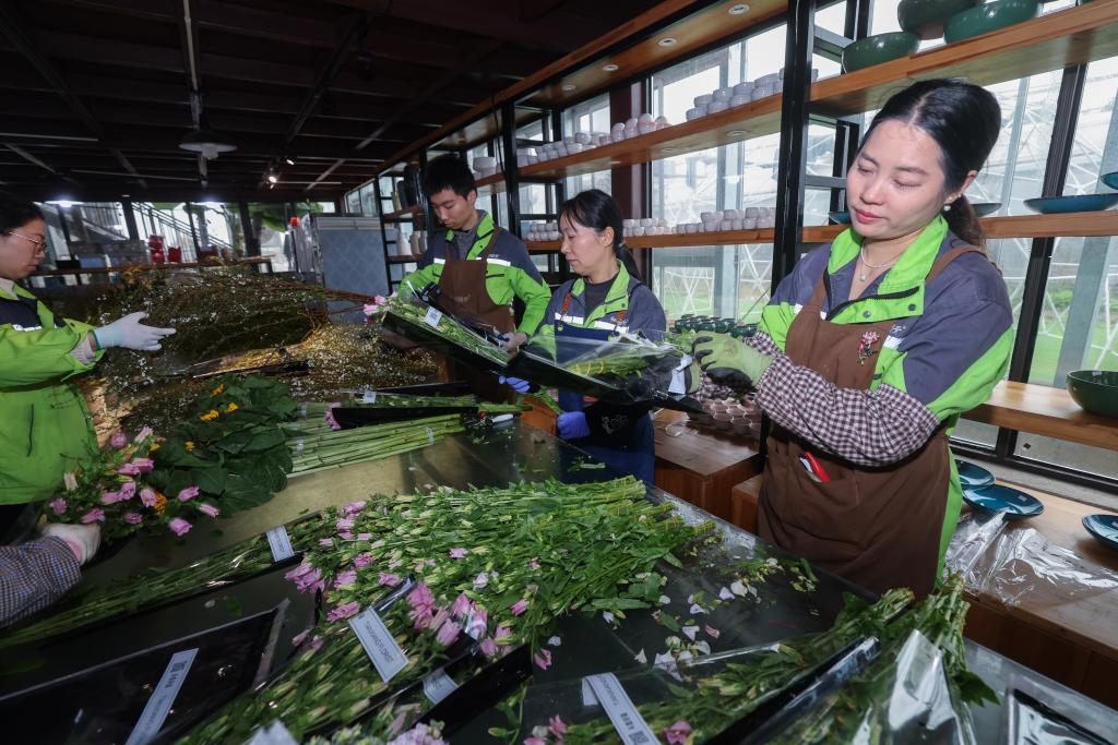 3月12日,在嘉兴市南湖区的嘉兴市神润斋鲜花种植基地,工作人员在打包鲜切花花束。