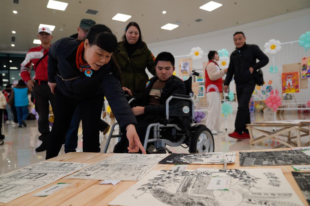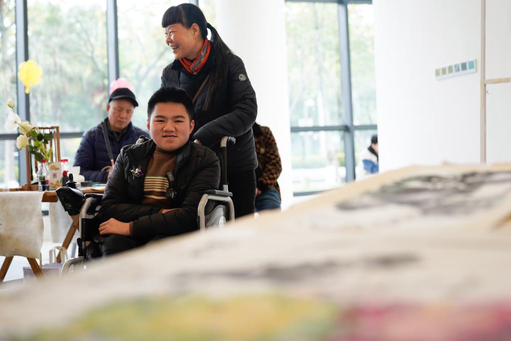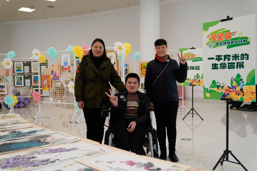 3月17日,在“X星球——艺能特展百人计划”活动上,胡星外婆(前左)检查作品标签牌。成骨不全症又称脆骨病