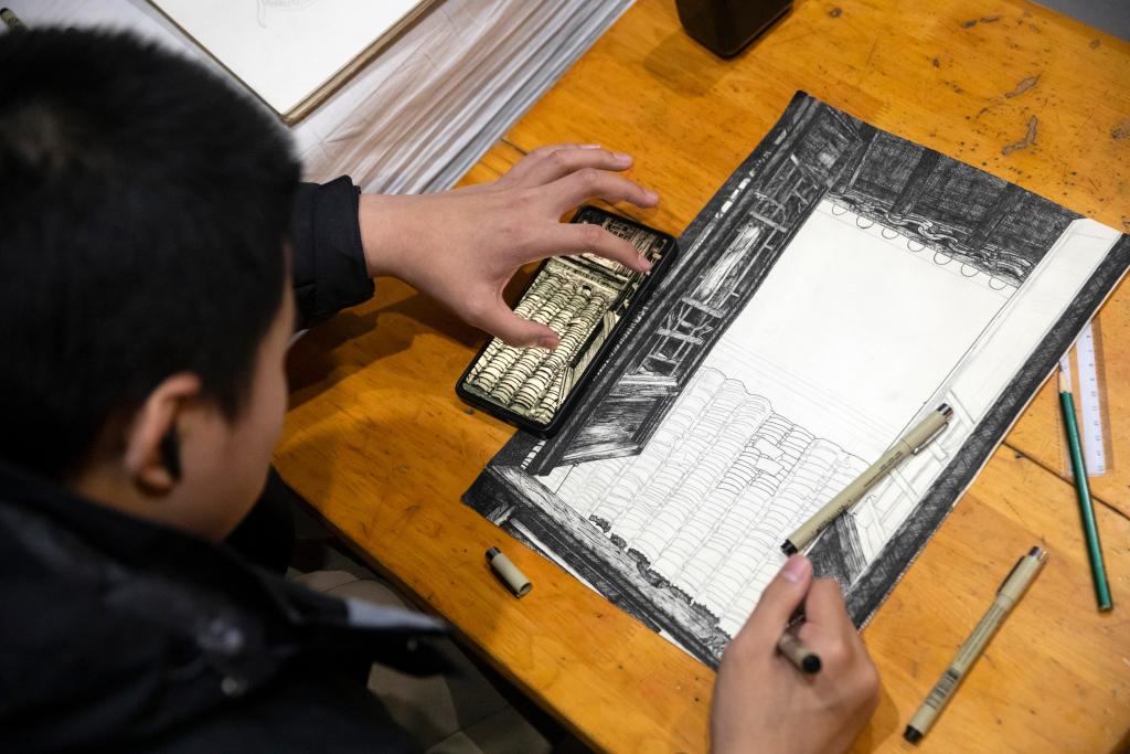 2月25日,胡星参照一张从互联网上找到的线描画作品进行临摹学习。