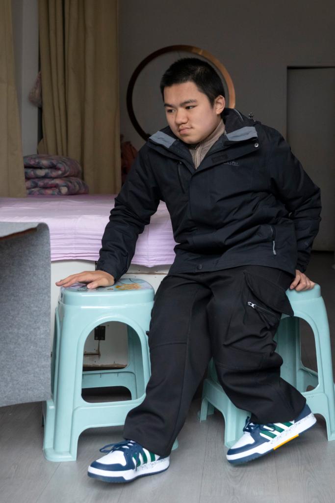 2月21日,在四川省成都市一家中医盲人理疗店里,胡星准备坐到桌前练习绘画。因身体条件所限
