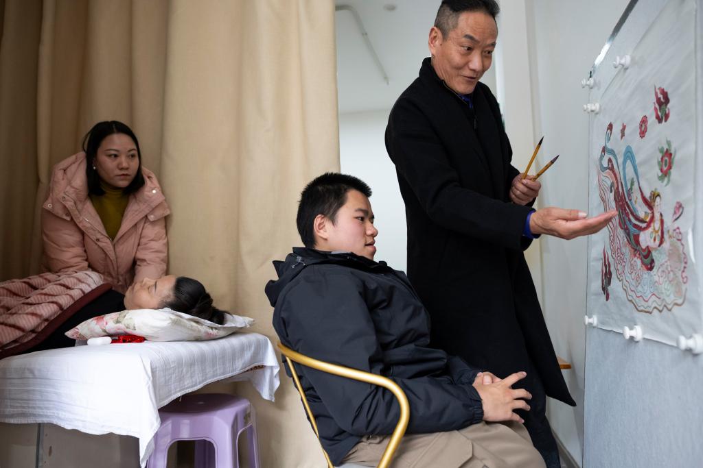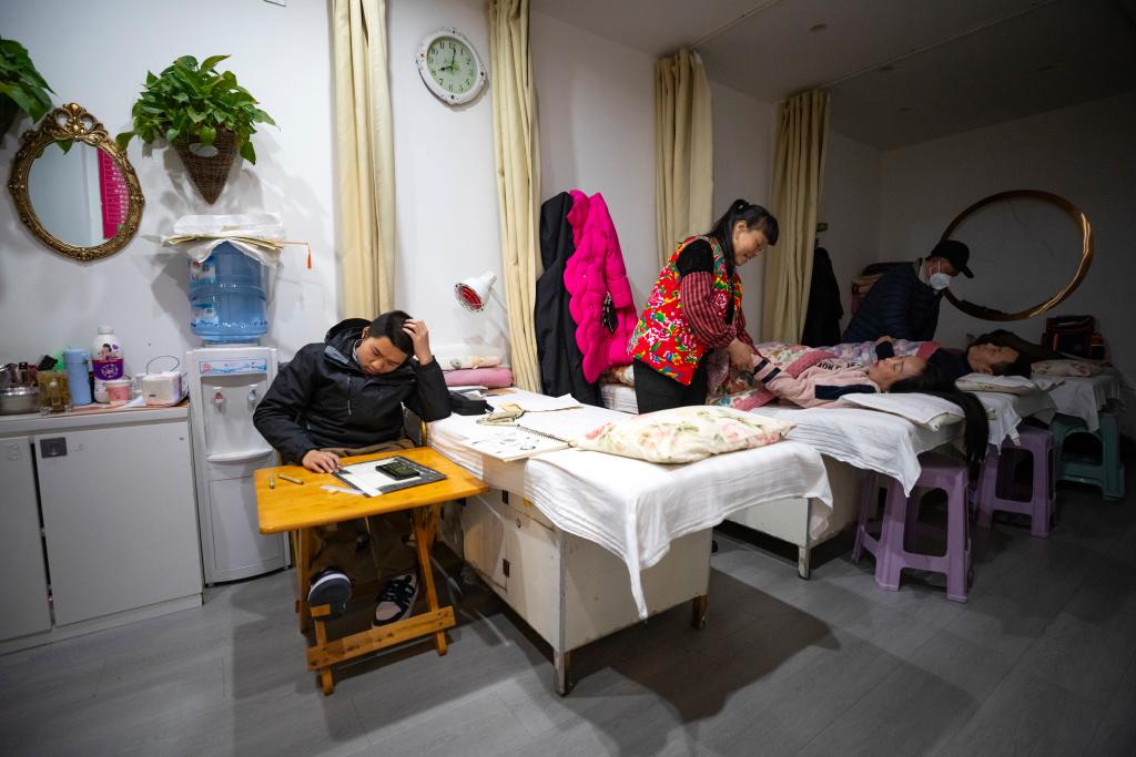 2月25日,胡星(左一)在练习画画,外公和外婆在为顾客做按摩理疗。