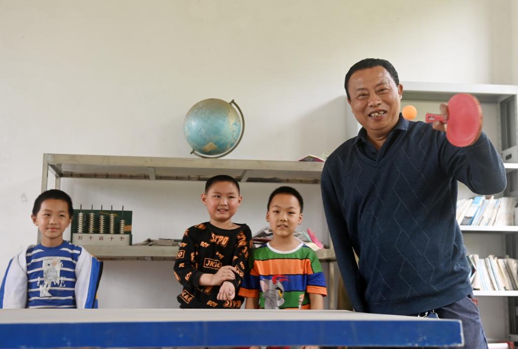 4月23日,在广西全州县白宝乡北山村小学,唐广芳老师教学生打乒乓球。