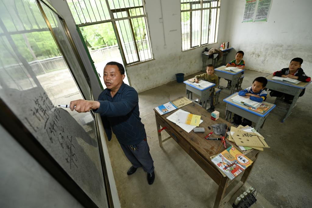 2016年4月26日,在广西全州县白宝乡北山村小学,唐广芳老师在给学生上课。