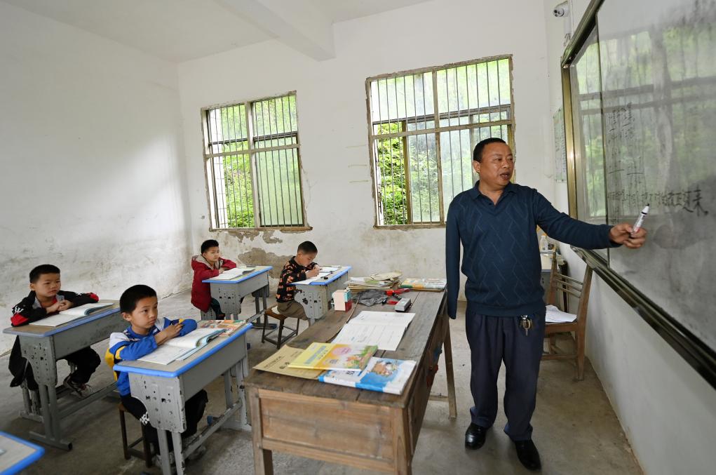 4月23日,在广西全州县白宝乡北山村小学,唐广芳老师在给学生上课。