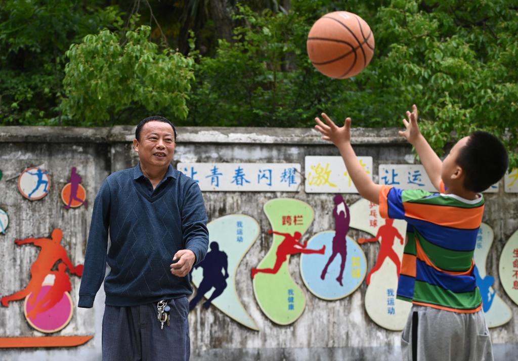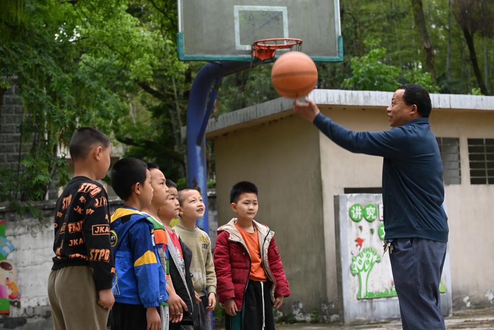 4月23日,在广西全州县白宝乡北山村小学,唐广芳老师教学生打篮球。