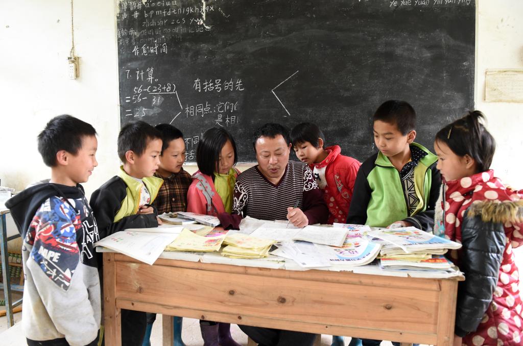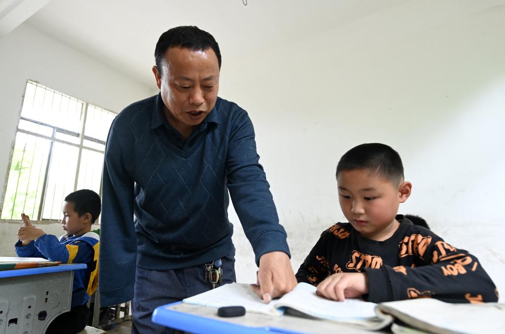 4月23日,在广西全州县白宝乡北山村小学,唐广芳老师在辅导学生功课。