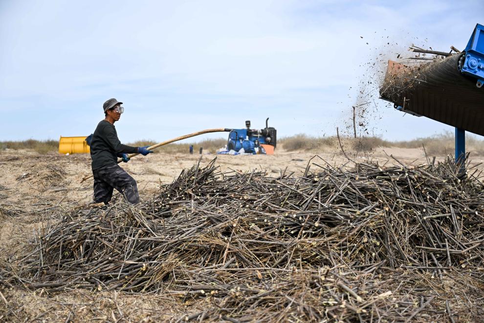4月28日,在杭锦旗境内的库布其沙漠,治沙工人在裁剪沙柳。