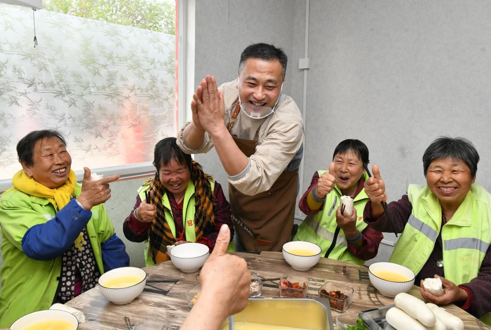 4月21日,在河北沧州渤海新区黄骅市“渤海暖心港湾”屋内吃早餐的环卫工人对吴玉良(左三)做的早餐连连称赞。