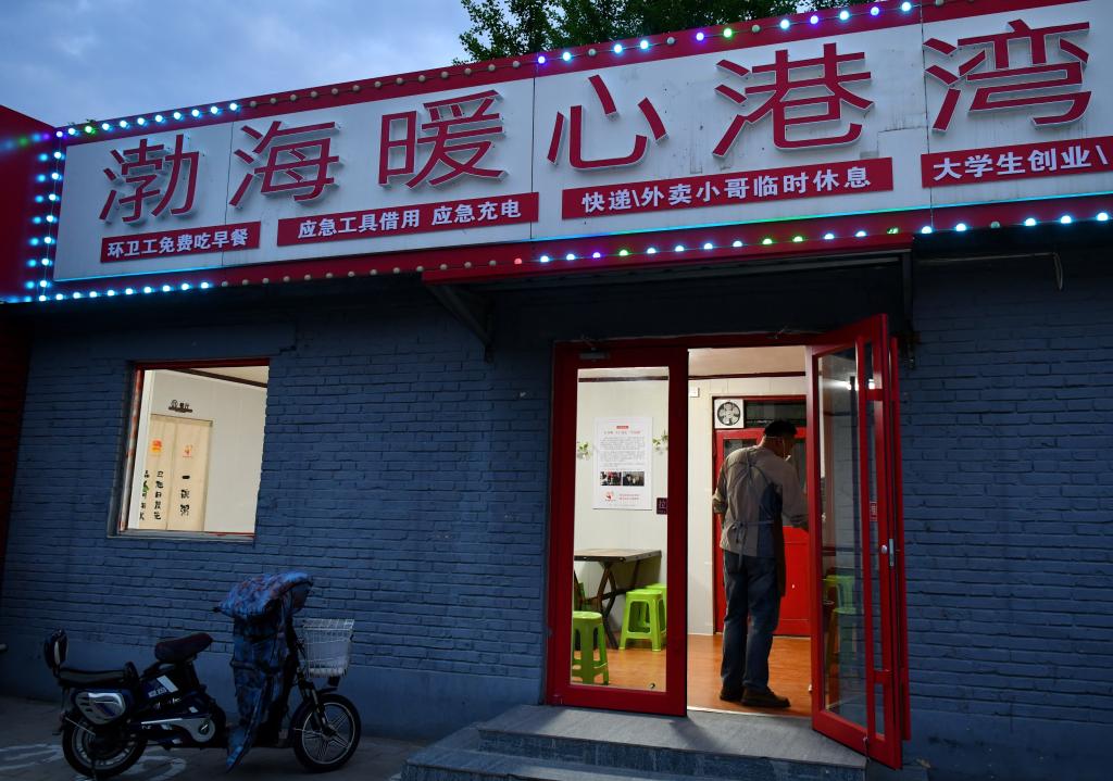 4月21日,吴玉良在河北沧州渤海新区黄骅市“渤海暖心港湾”门前迎接准备来吃早餐的环卫工人。