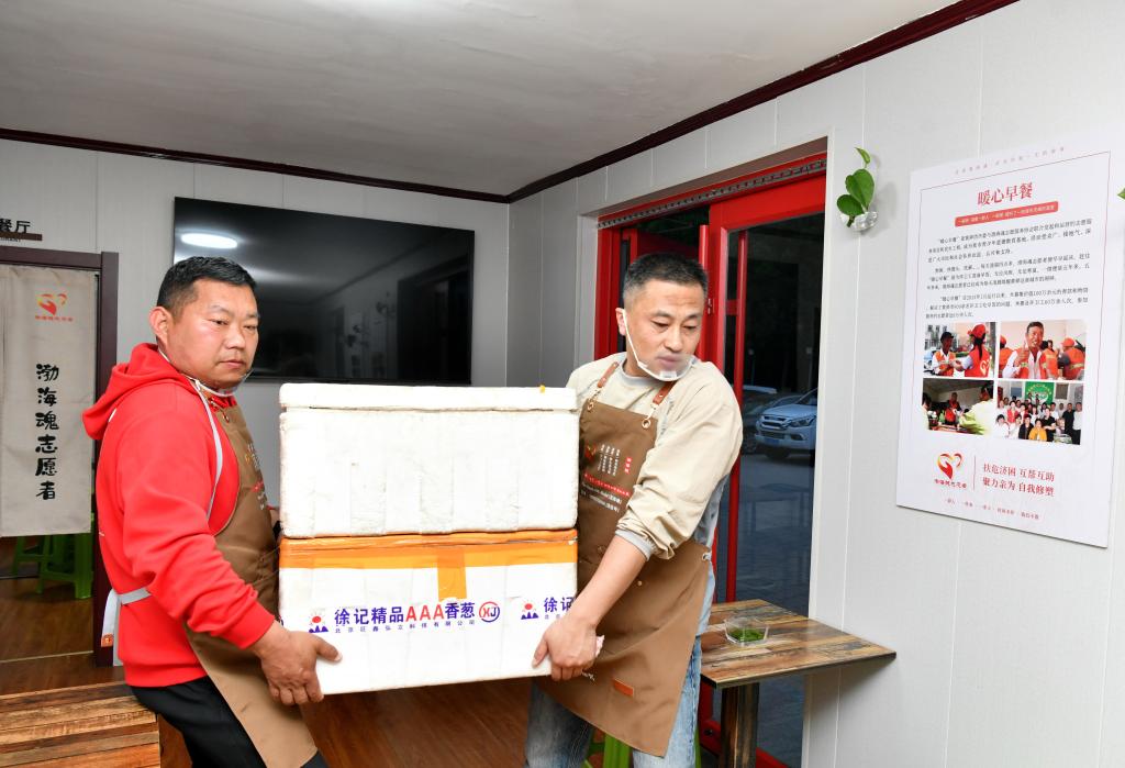 4月21日,吴玉良(右)和志愿者伙伴将采购的物品搬进河北沧州渤海新区黄骅市“渤海暖心港湾”。