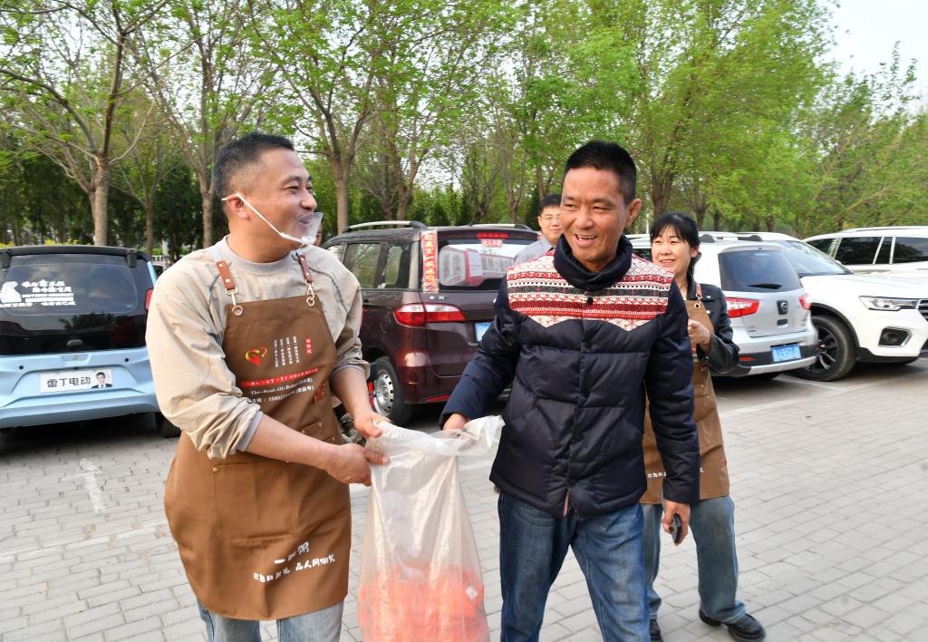 4月21日,吴玉良(左)在河北沧州渤海新区黄骅市“渤海暖心港湾”门前接受爱心人士送来的小米。