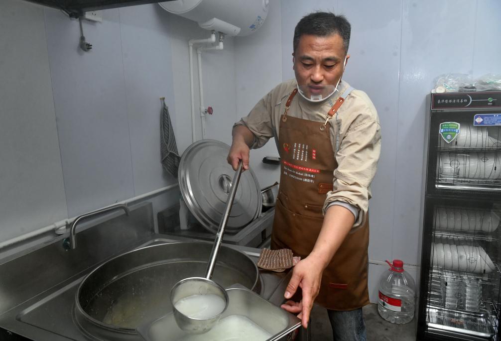 4月21日,吴玉良在河北沧州渤海新区黄骅市“渤海暖心港湾”为环卫工人准备早餐。