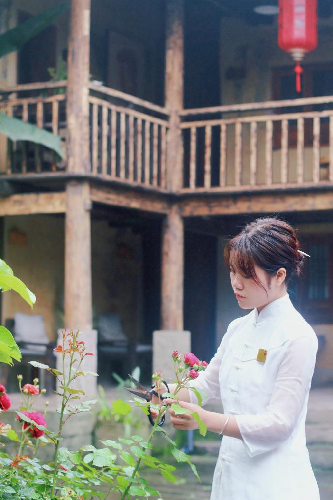 挎上竹篮,拿起剪刀,记者跟随朱静踏进院子旁的小花园采摘野蔷薇等鲜花。随后,再将摘下来的各色花叶一一插入花瓶,作为每间客房的摆件点缀。